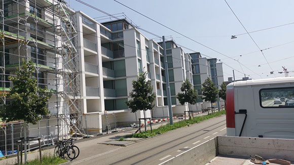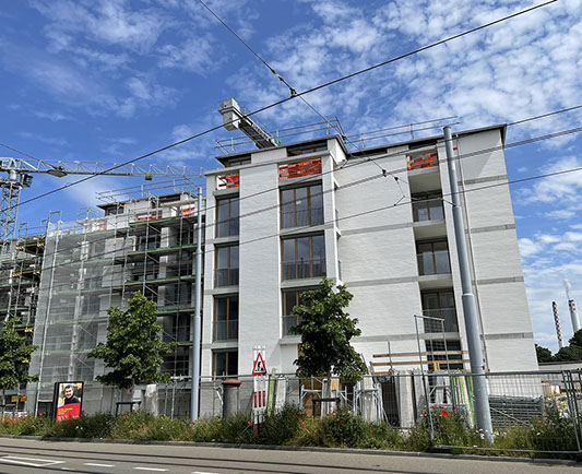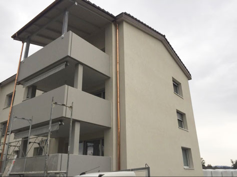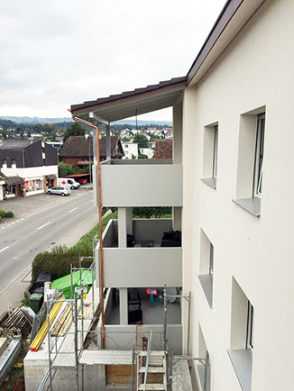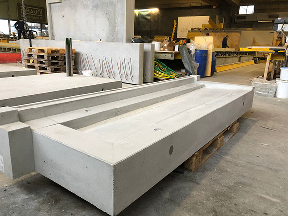 Die Fertigteilbalkone sind mit Gefälle- und Bodenablauf ausgebildet und weisen eine schalungsglatte Oberfläche und fein geglättete Unterseiten auf. Nuancen und Farbspiele von schalungsglattem Sichtbeton sind natürliche Merkmale unserer Produkte.